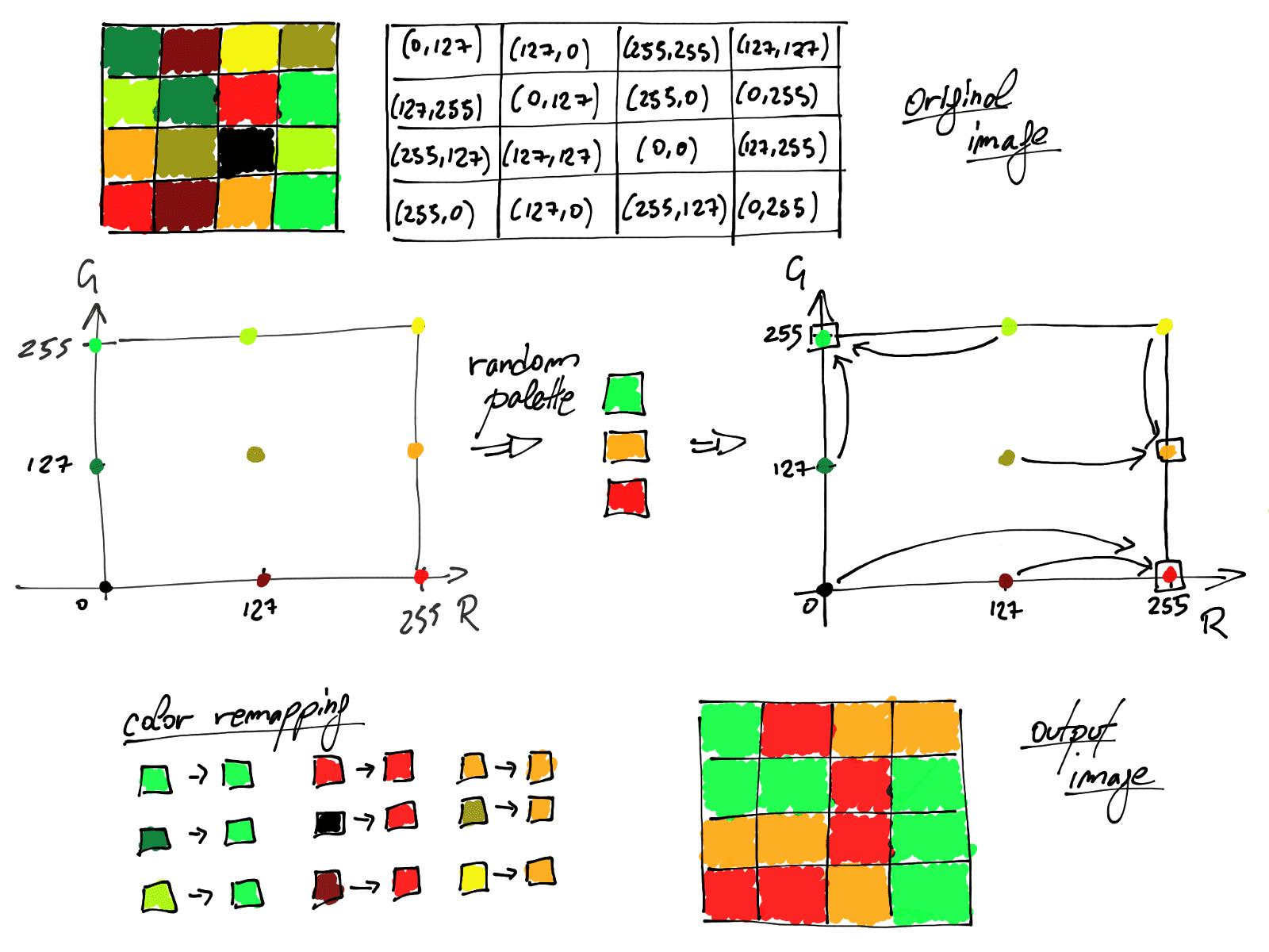 In the following figure, it's visually explained the whole process in case of RGB space where the final palette is composed of three colors (for Lab space is completely analogous). For simplicity in this example, the blue channel is fixed to the value of , hence we can consider only the and the dimensions. All the pixels of the image are represented with the RGB encoding and then mapped into the RGB space. Then 3 random colors are selected to be part of the palette. Finally, all the colors are remapped to the nearest selected color according to the Euclidean distance.
