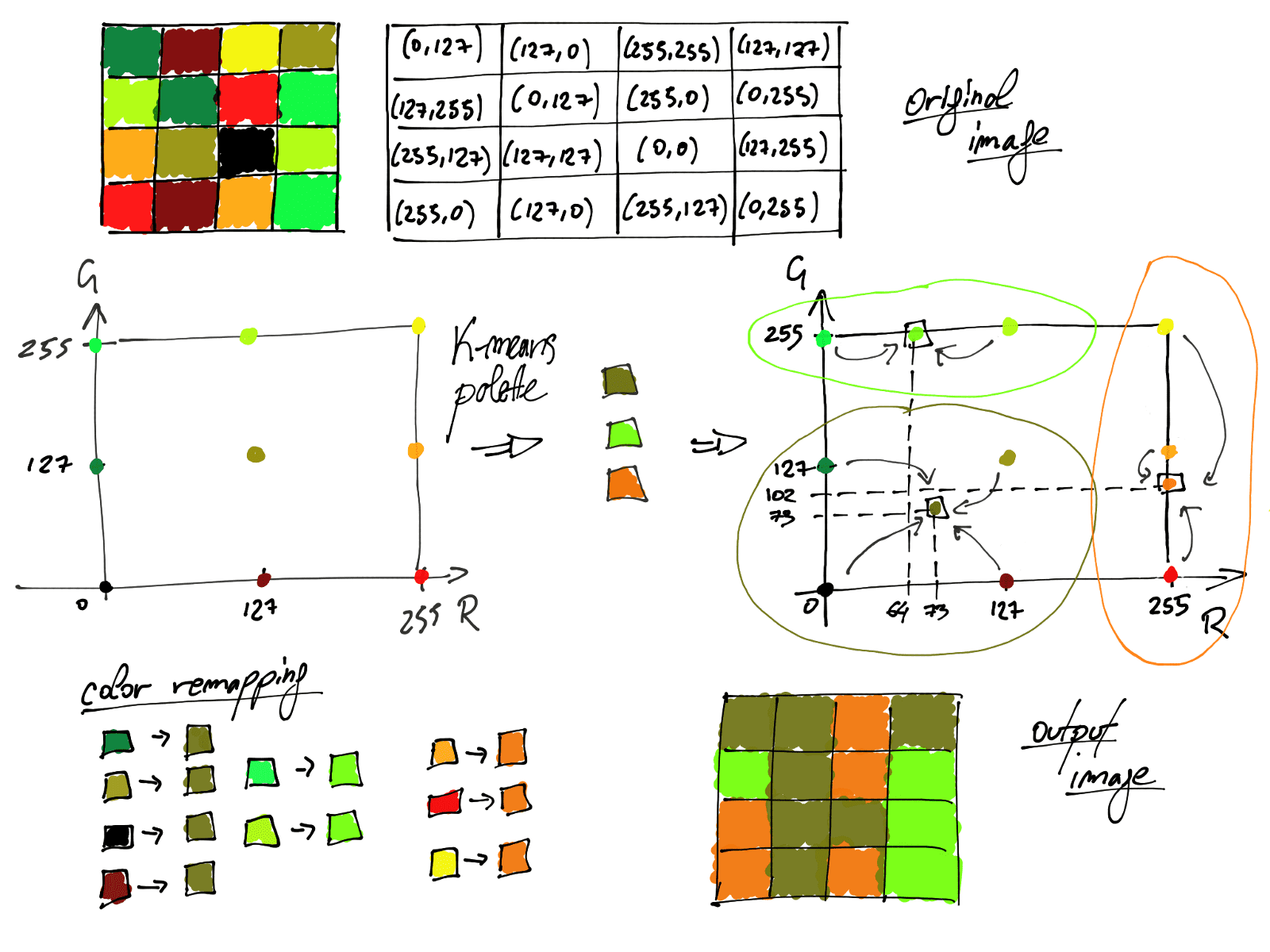 Remember that the Euclidean distance in Lab space is uniform with the difference perceived by the eye. Hence with this kind of selection, we can expect that using the Lab space should have a visually better result than RGB. Similarly to the other figure in the following one, it's visually explained the whole process in case of RGB space, but using the k-means algorithm. Even in this example, the final palette is composed of three colors and the blue channel is fixed to the value of for simplicity. All the pixels of the image are represented with the RGB encoding and then mapped into the RGB space as in the case of the random selection. Then the k-means algorithm is applied and the centroids of the cluster are selected to be part of the palette. Finally, as in the random palette selection, all the colors are remapped to the nearest selected color according to the Euclidean distance.