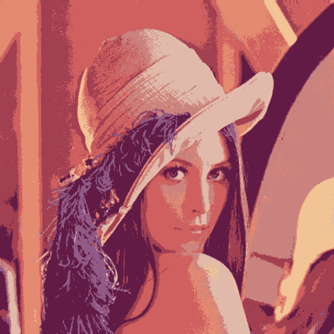 The procedure consists of applying the k-means algorithm with a number of centroids that is equal to the number of colors we want the palette to be composed of. Then we use the resulting centroids as the colors that will be part of the palette. After that, each color is remapped to the nearest one among those in the palette as in the random selection. Given the nature of k-means, the nearest color corresponds exactly to the centroid representing the cluster the color is part of.